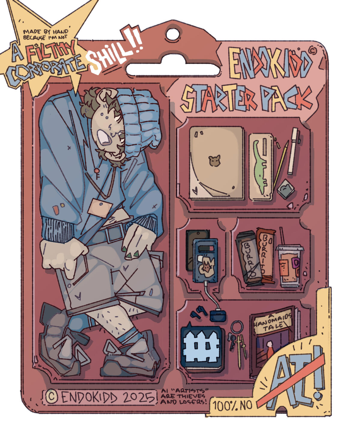 Endokidd is an illustrator and comic artist based in Boston, MA. After many years drawing and reading comics, he pursued a Visual Arts focus at Walnut Hill School for the Arts, and later a BFA in Studio Art at SMFA/Tufts University. During his undergraduate study, he won the 2022 SMFA Graphic Arts Annual award for Sequential Art, and illustrated the published title Jada Saves the Day. In April 2024, he shipped his first indie game project as an Art Director with Eco-Detectives, during an internship at FableVision Studios. His self-published comics have sold at Silver Sprocket and MICE Expo.